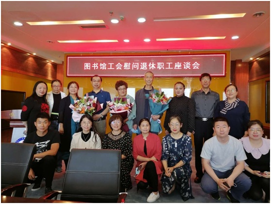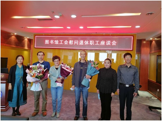 王焕芸副馆长,程鸿副馆长和李军主席为退休教职工献上鲜花和礼品,全体参加座谈会人员合影留念。