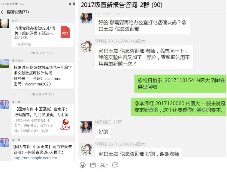 根据学校要求,图书馆及时全面掌握全馆教职工动态,严格落实值班值守制度和报告制度,调整师生文献服务方式,确保24小时电子资源线上服务不间断。通过微信、QQ群、电话等方式及时向师生发布图书馆信息资源开通免费服务信息、在线解答读者关于防疫期间图书馆服务问题的咨询,通过VPN完成研究生开题查新工作。通过图书馆公众号、网页等推送有关疫情及心理辅导的资源、讲座等。