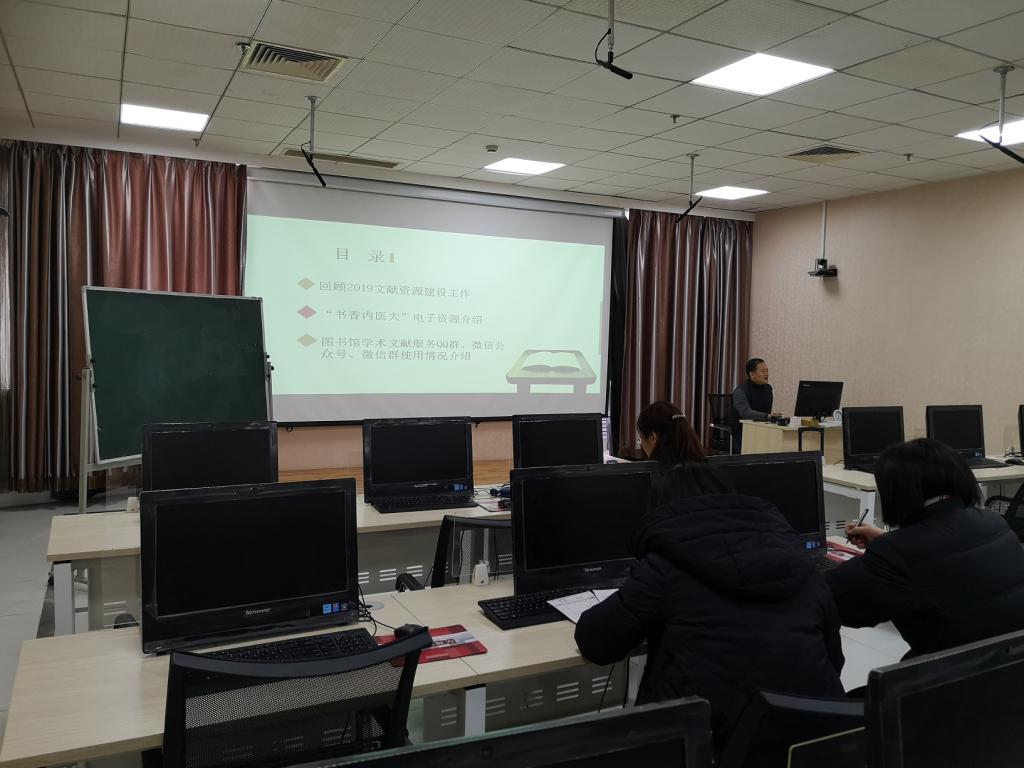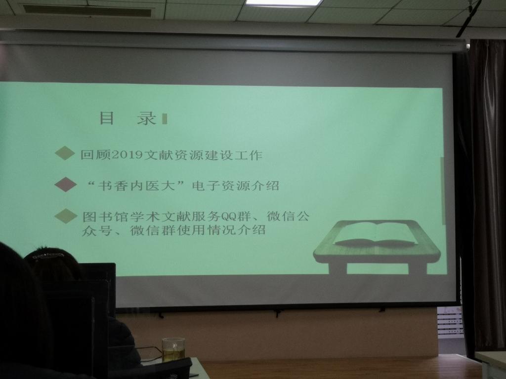 此次业务讲座主要回顾了2019年图书馆文献资源建设工作,对“书香内医大”电子资源进行介绍,并将图书馆的学术文献服务QQ群、微信群、微信公众号的使用情况进行介绍。