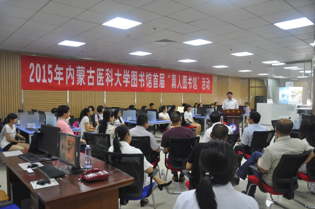 2015年7月1日下午15:00,内蒙古医科大学图书馆也是内蒙古自治区首届“真人图书馆”正式开馆。首届“真人图书馆”邀请到的是内蒙古医科大学教务处处长李存保教授,李存保教授作为首届“真人图书”在内蒙古医科大学金山校区图书馆三楼IC数字信息共享空间与读者“共读”。牛广明副校长、机关各处室负责人和学生代表共计70多人参加了本次活动。