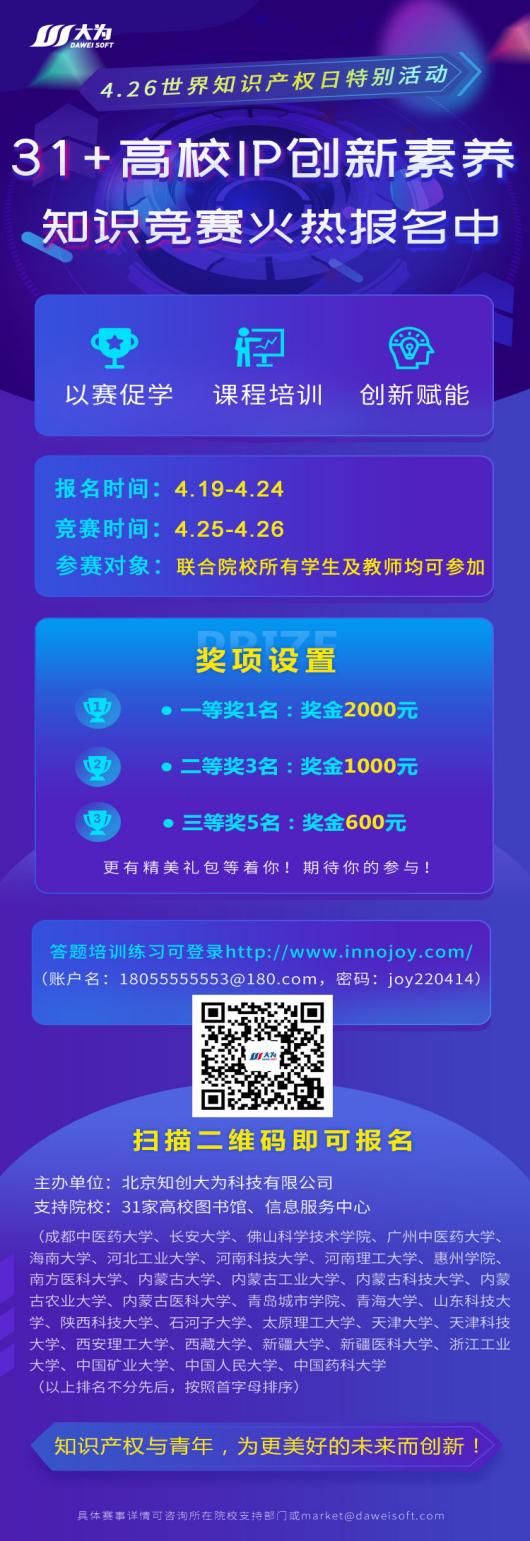 知识产权是知识经济的重要象征,是原始创新、技术创新的具体体现。而新时代的青年力量与智慧更是焕新知识产权与推动未来建设启程的锋芒。为迎接2022年4月23日世界读书日和4月26日世界知识产权日的到来,我校与大为知识产权公司联合全国31所高等院校举办“31+高校IP精英创新素养知识竞赛”,旨在展示现代高校知识产权人才风采,推动高校知识产权基础知识普及和高质量发展,促进高校大学生的自我认知与创新挑战,不断深化知识产权保护的核心理念及教育文化水平,更好地营造一种更加开放、更加积极、更有活力的校园智慧创新氛围,拥抱开创美好未来。现将有关事宜通知如下: