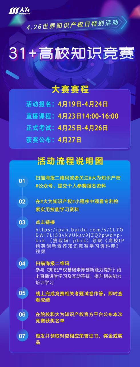 2、4月23日14:00-16:00,所有报名参赛选手均可报名《知识产权基础素养创新能力提升》线上直播讲堂,参与线上学习及互动答疑,提升相关能力培训学习;