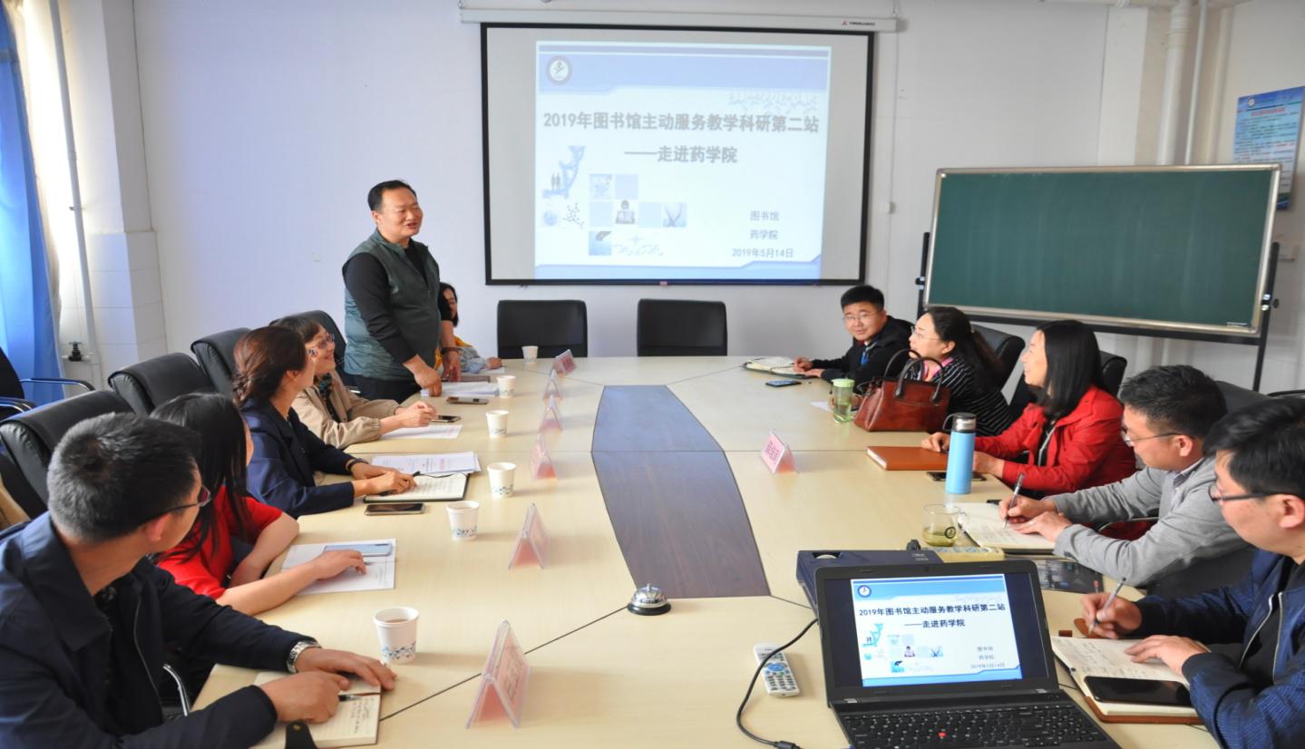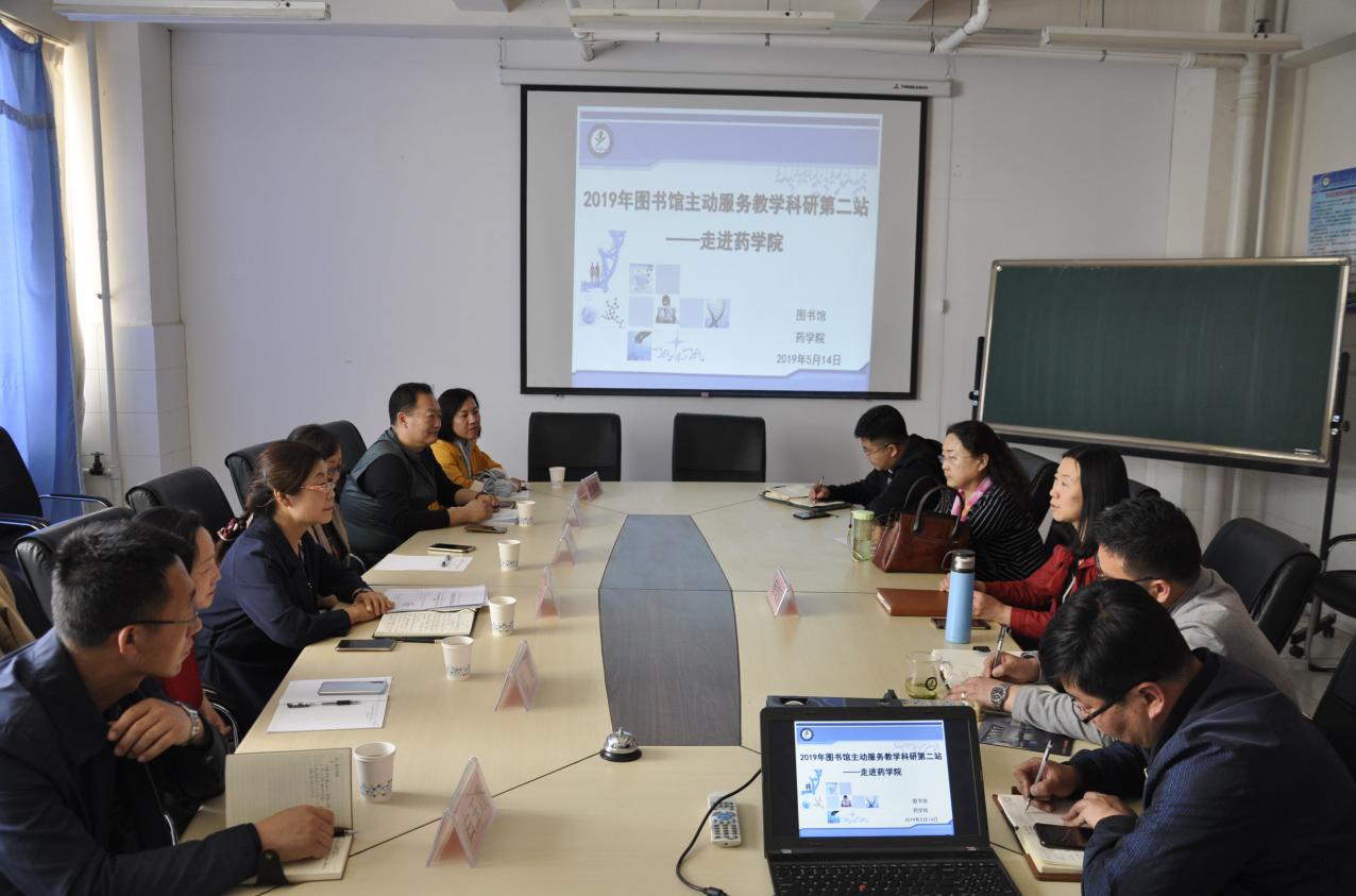 5月14日下午,图书馆主动服务教学科研第二站,图书馆党总支副书记王焕芸、有关部室主任及学科馆员等一行九人来到药学院207会议室,药学院薛培凤副院长、相关教研室主任、学科服务教师顾问及教师代表参加会议,会议由图书馆文献资源建设部主任皇甫军主持。