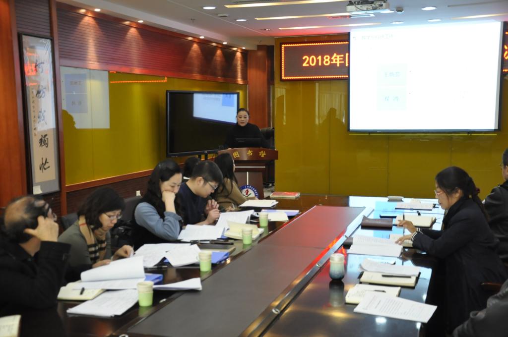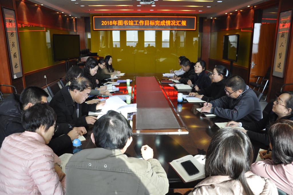 会议由图书馆党总支副书记王焕芸主持,程鸿副馆长作了图书馆2018年目标管理工作完成情况的汇报,汇报内容包括:重点工作、专项工作和常规工作。汇报结束后,考核工作组通过提问、交流讨论等方式对我馆2018年目标管理考核工作进行了全面评价,并提出希望我馆进一步加强外文文献资源建设、数据平台建设和学科精准服务等工作。