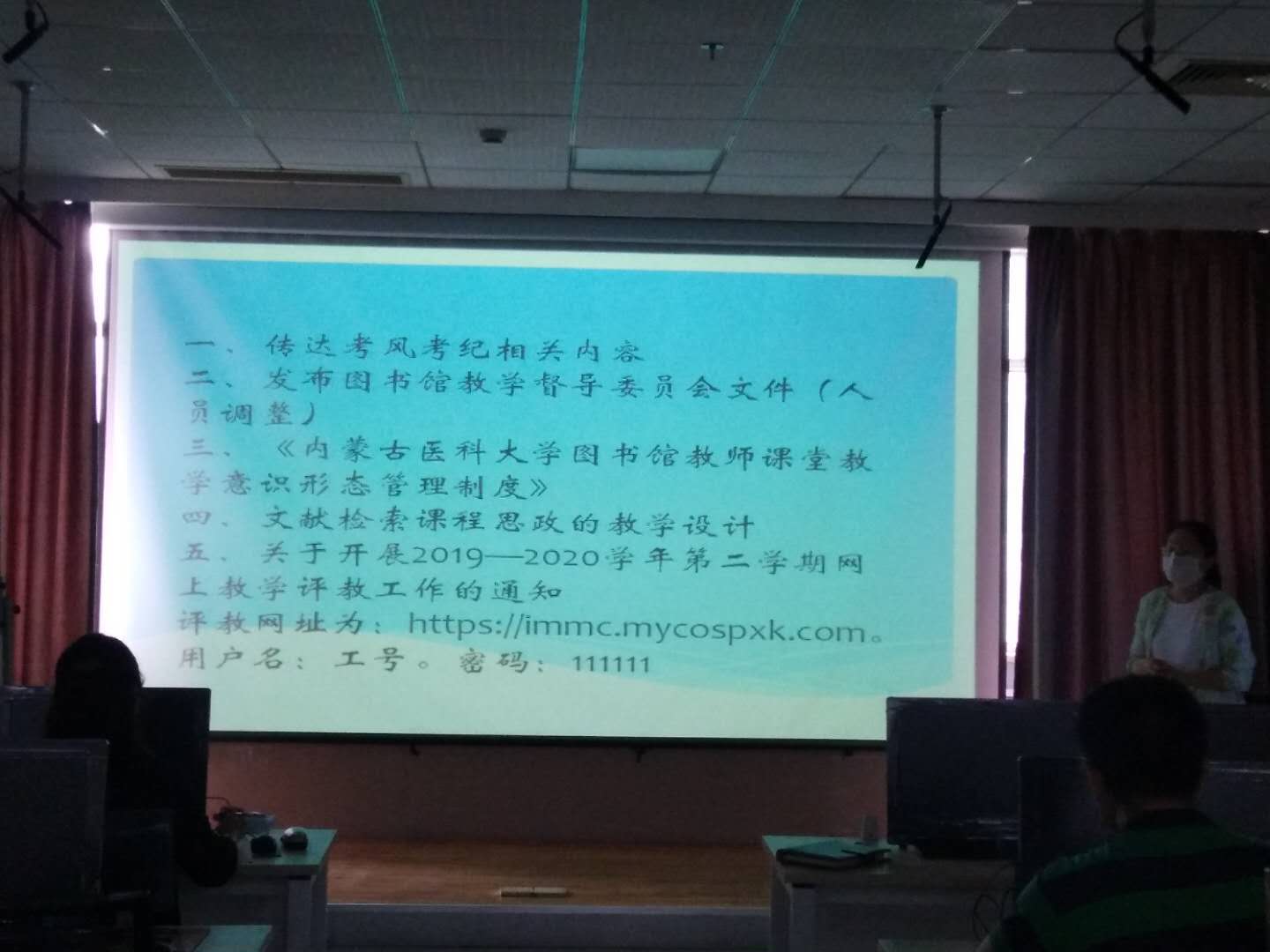 会上,王焕芸副馆长传达了学校《内蒙古医科大学考风考纪专项治理工作方案》的相关内容及学校考风考纪专项治理工作的精神。并对2019-2020年度第二学期期末考试相关工作进行安排,要求任课教师在疫情防控期间,一方面要做好命题、试卷印制、监考等相关工作,另一方面加强考风考纪工作,注意各项工作细节,严抓落实,营造严肃、公正、诚信守信的考试氛围,保质保量完成本学期的教学任务。