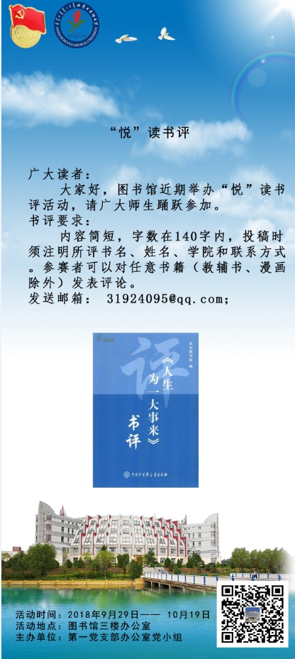 内容简短,字数在140字内,投稿时须注明所评书名、姓名、学院和联系方式。参赛者可以对任意书籍(教辅书、漫画除外)发表评论。